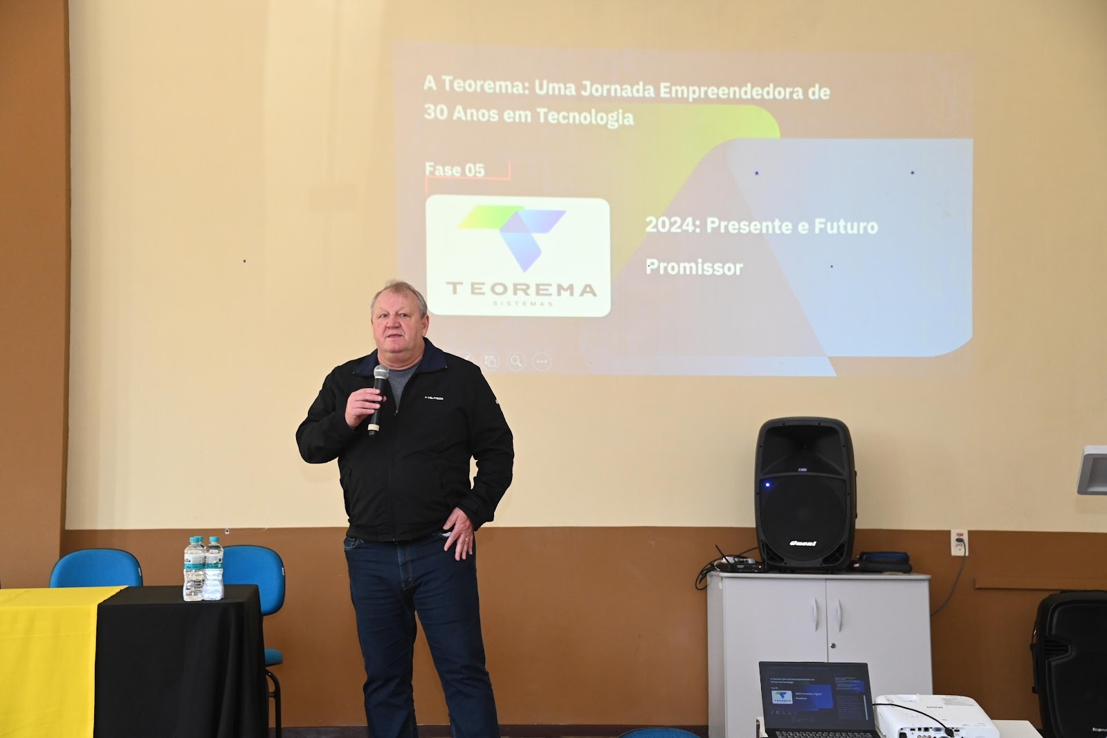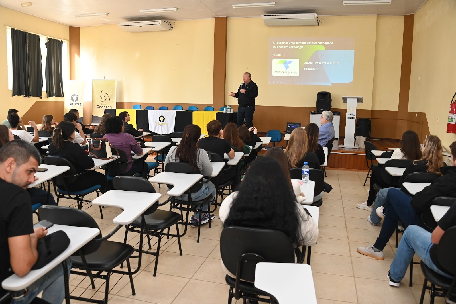 À tarde, o CEO da Teorema, Rui Primak, conduziu uma palestra e roda de conversa no auditório do Câmpus Cedeteg, compartilhando sua trajetória como empreendedor, os desafios de construir uma empresa sólida no Brasil e a importância da educação na transformação de vidas.